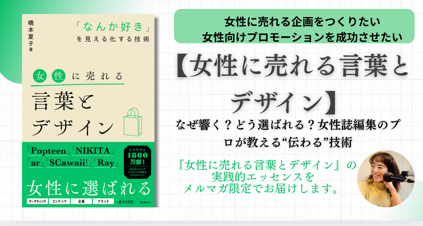 女性誌編集歴20年以上の橋本夏子が、「女性に響く言葉とデザイン」の秘訣をわかりやすくお届け。 “売れるには理由がある” 女性の心をつかむ“伝わる”仕組みとは?と企画・コピー・デザイン・コミュニケーションにも活かせる実践的エッセンスを、メルマガ限定でお届けします。女性の気持ちを理解するためのノウハウをお伝えしますので、女性の細やかな心理を理解する教科書としても活用いただけます。